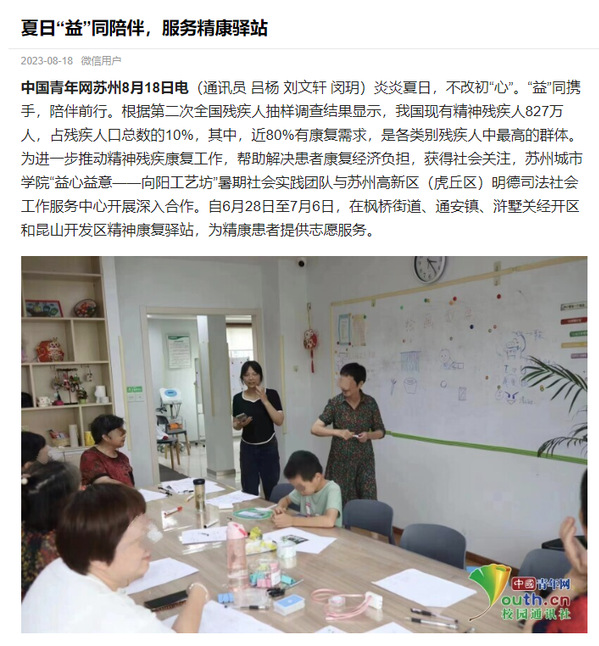 炎炎夏日,不改初“心”。“益”同携手,陪伴前行。根据第二次全国残疾人抽样调查结果显示,我国现有精神残疾人827万人,占残疾人口总数的10%,其中,近80%有康复需求,是各类别残疾人中最高的群体。为进一步推动精神残疾康复工作,帮助解决患者康复经济负担,获得社会关注,苏州城市学院“益心益意——向阳工艺坊”暑期社会实践团队与苏州高新区(虎丘区)明德司法社会工作服务中心开展深入合作。自6月28日至7月6日,在枫桥街道、通安镇、浒墅关经开区和昆山开发区精神康复驿站,为精康患者提供志愿服务。