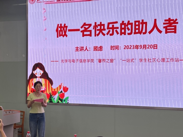顾虑以“做一个快乐的助人者”为题作讲座。她从大学生常见心理问题的识别与干预、助人者需要储备的心理健康知识以及助人者需要具备的心理健康态度、技术三个方面出发,并结合自己在心理健康育人工作中干预的案例,向心理委员详细讲解了如何去辨别心理危机,力所能及地支持有心理困难的同学。同时,她也强调助人者要清楚自己的局限性,在助人过程中要关注自己的心理状态。