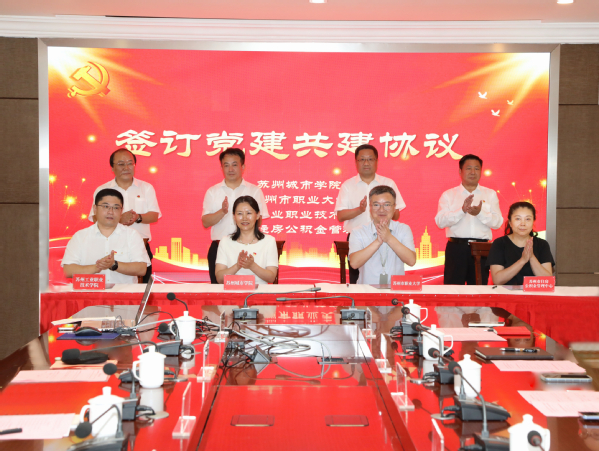 我校党委常委、组织部部长、统战部部长、人事处(党委教师工作部)处(部)长孙德芬,苏州市职业大学党委委员、组织人事部部长鲜学丰,苏州工业职业技术学院党委委员、组织统战部部长、人事师资处处长陈艺,苏州市住房公积金管理中心机关党委书记、副主任严颖上台共同签订党建共建协议,芮国强、曹毓民、王洪法、何静清共同见证签约。