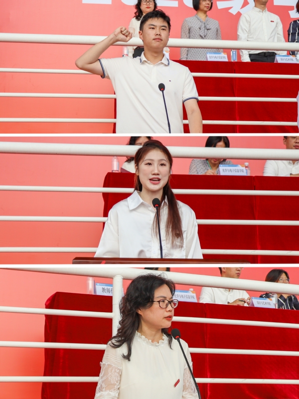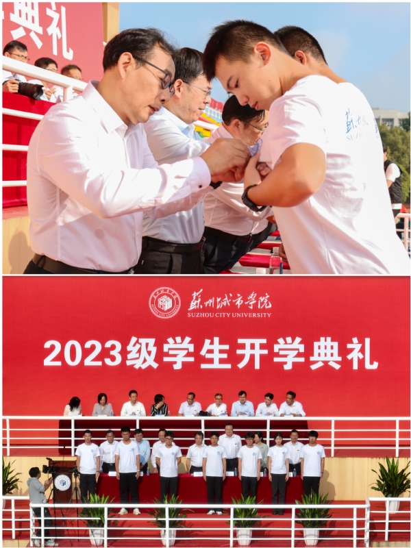 “肩负时代重任,厚植家国情怀,提升综合素养,锤炼品德修为,为实现苏城梦、中国梦而努力奋斗!”全场新生跟随领誓人宣誓,铮铮誓言映初心。典礼现场,各位校领导为新生代表佩戴校徽。校徽是学校办学精神、气质风采的形象化标识,是时代精神和办学理念的折射,是学校思想文化内涵的外在体现,更承载着苏城院人的使命与担当。期望新生牢记师长的寄语与教诲,坚守本心,用拼搏和努力去创造美好未来,用青春和奋斗汇聚起前行的磅礴力量。