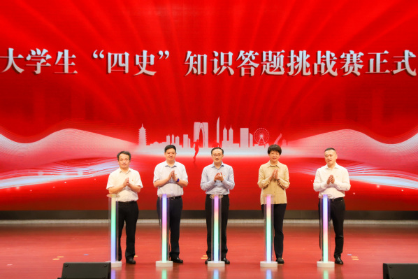 王飏、朱江、周志芳、石磊、芮国强共同上台,共同点亮启动灯柱,本届“四史”知识竞赛正式启动。