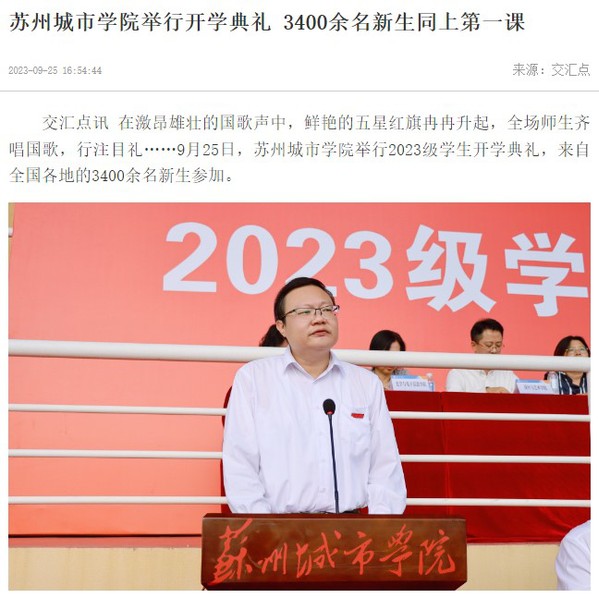 在激昂雄壮的国歌声中,鲜艳的五星红旗冉冉升起,全场师生齐唱国歌,行注目礼……9月25日,苏州城市学院举行2023级学生开学典礼,来自全国各地的3400余名新生参加。