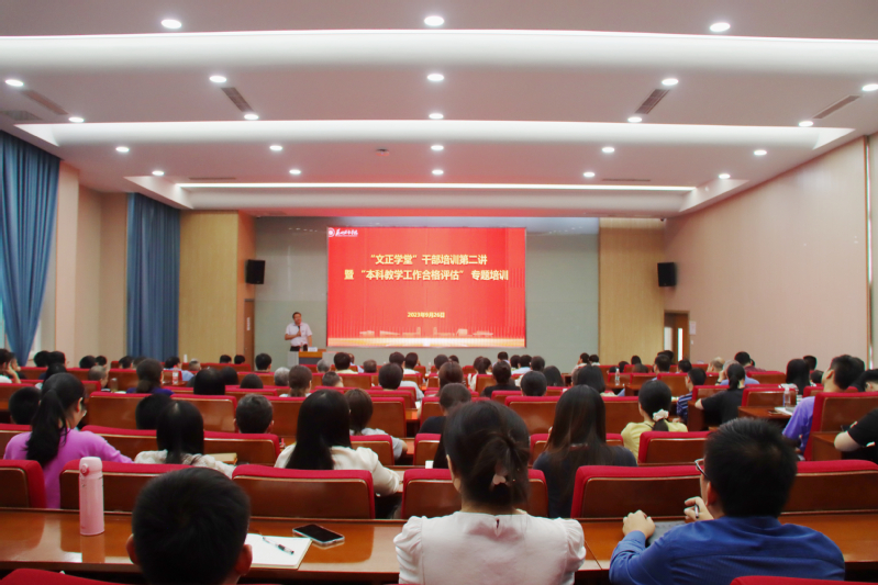 为提升学校干部综合能力,切实提高本科教育教学水平,为迎接本科教学工作合格评估做好准备,9月26日下午,我校在3-101举办2023年“文正学堂”干部培训第二讲暨“本科教学工作合格评估”专题培训。教育部本科教学工作审核评估专家、昆山登云科技职业学院校长张进明,我校党委副书记、校长赵志宏,党委常委、副校长高雷,全校处级干部、部门临时负责人,全校科级干部,各系(专业)负责人、教务秘书参加活动。活动由赵志宏主持。