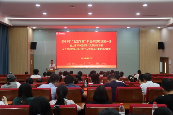 为深入学习贯彻习近平新时代中国特色社会主义思想和党的二十大精神,深入实施“干部队伍建设与能力提升年”行动,推进科级干部政治能力和专业能力双提升, 9月27日上午,我校举办2023年“文正学堂”科级干部培训班第一场集中培训。苏州市委党校经济研究室主任、教授王涛,全校科级干部参加活动。活动由我校党校副校长陈波主持。