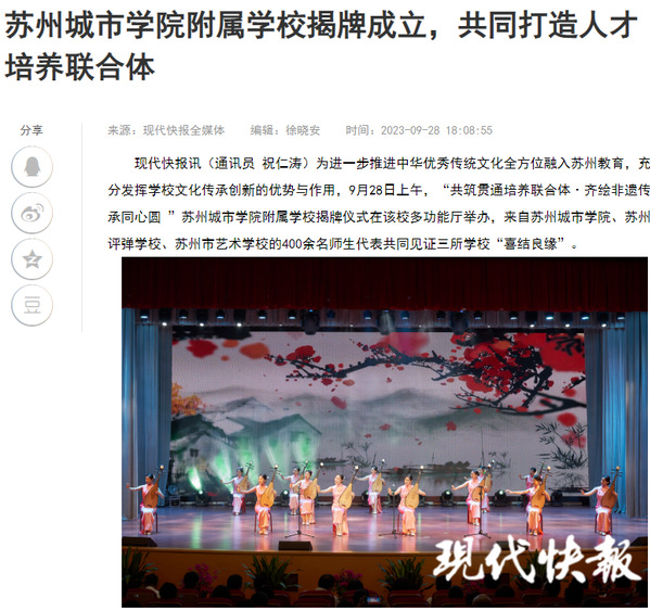 苏州城市学院由苏州大学文正学院转设而来,学校始终将改革创新融入发展血脉,坚持“走在前、做示范”,并将范仲淹的忧乐精神与家国情怀作为学校的办学品位与育人追求。转设以来,该校先后成立苏州未来城市设计研究院、非物质文化遗产研究院、当代作家创作与研究中心、古籍整理研究所、品牌研究院,建设太湖研究院等科研平台,持续推动中华优秀传统文化、苏州江南文化的保护传承、转化发展。此次揭牌成立苏州城市学院附属学校,是该校传承中华优秀传统文化的又一次重要实践。