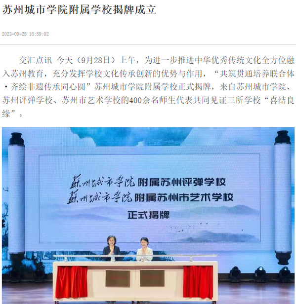 今天(9月28日)上午,为进一步推进中华优秀传统文化全方位融入苏州教育,充分发挥学校文化传承创新的优势与作用,“共筑贯通培养联合体·齐绘非遗传承同心圆”苏州城市学院附属学校正式揭牌,来自苏州城市学院、苏州评弹学校、苏州市艺术学校的400余名师生代表共同见证三所学校“喜结良缘”。
