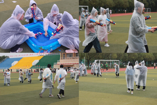 第二个环节是混沌拾快乐(水枪追击战)。在这一环节,工作人员提前准备好雨衣和水枪,参与者在指定区域内活动,以学院为阵营进行水枪战斗。参与者们穿着雨衣,自由移动、躲避水枪攻击或进行反击,展现出了出色的团队协作和策略思维,他们相互配合,共同争夺胜利,增强了师生情谊和默契。