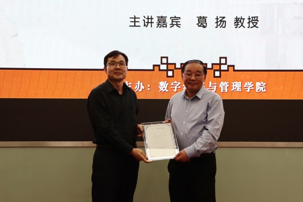 在讲座最后,尹维军代表学校向葛扬颁发的“文正大讲堂”嘉宾纪念证书。