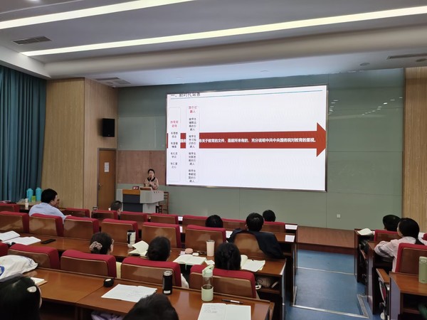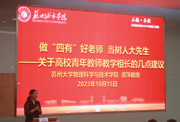 为加强我校师资队伍建设,提高新入职教师教学能力和岗位履职能力,促进新教师职业角色转变,引导新教师做“经师”与“人师”的统一者,做学生为学、为事、为人的大先生,进一步弘扬教育家精神,2023年10月15日上午,教务处邀请苏州大学物理科学与技术学院教授、苏州城市学院教学督导须萍对我校新入职教师进行专题培训,讲座由教务处处长施盛威主持。