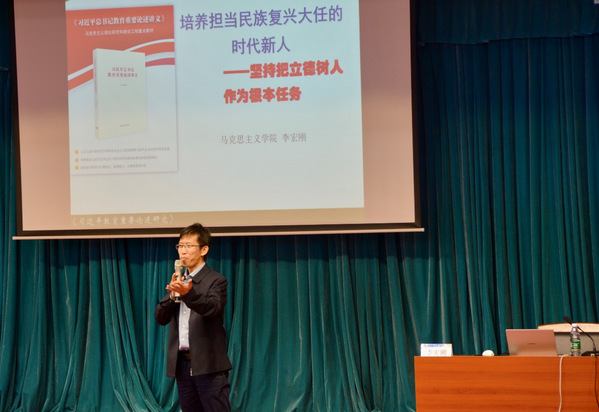 开班仪式结束后,李宏刚讲授开班第一课、“信仰公开课”校级示范课《培养担当民族复兴大任的时代新人》。李老师基于《习近平教育重要论述研究》,从“教育是立德树人的事业”“把培育和践行社会主义核心价值观融入国民教育体系”“培养德智体美劳全面发展的社会主义建设者和接班人”三个方向展开授课,引导学员们树立远大的理想和抱负,坚定马克思主义信仰,坚守共产主义信念,培养德智体美劳全面发展,争做有理想、敢担当、能吃苦、肯奋斗的能担当民族复兴重任的时代新人。