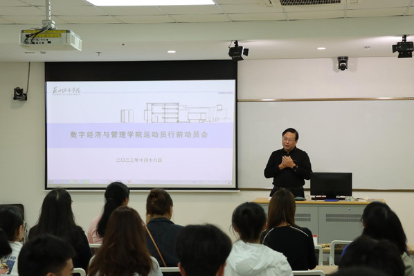 为了增强师生身体素质,提高师生健康水平,全面推进新时代体育事业高质量发展,10月18日下午,数字经济与管理学院在综合楼122组织召开学院运动员行前动员大会,校党委常委、副校长、数字经济与管理学院院长(兼)周高,学院全体教工及学生运动员参会。