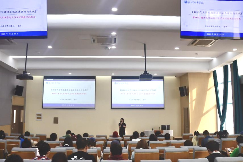 10月25日,廉洁文化教育公共选修课《新时代大学生廉洁文化涵养理论与实践》第四讲在2-201开展授课,由校纪委审查调查处副处长虞萍主讲。