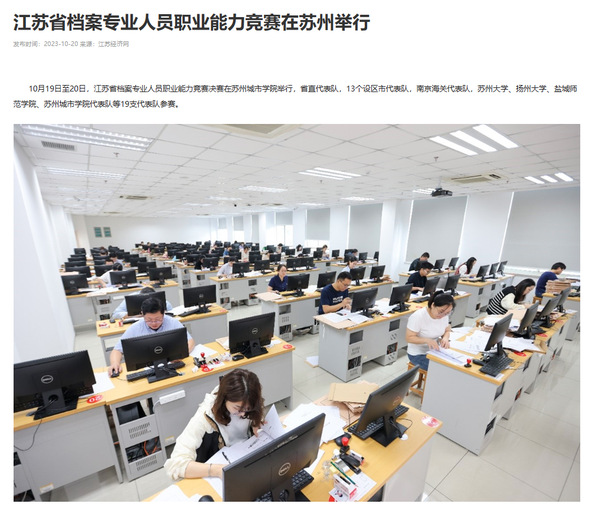 10月19日至20日,江苏省档案专业人员职业能力竞赛决赛在苏州城市学院举行,省直代表队,13个设区市代表队,南京海关代表队,苏州大学、扬州大学、盐城师范学院、苏州城市学院代表队等19支代表队参赛。