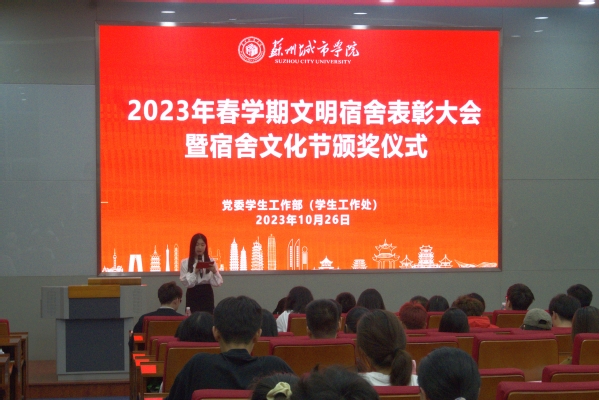 为进一步提升校园精神文明建设,充分发挥宿舍文化育人功能,努力营造文明健康的育人环境,充分展示苏城学子的精神风貌,10月26日晚,党委学生工作部(学生工作处)在3-101举行苏州城市学院2023年春学期“文明宿舍”表彰大会暨宿舍文化节颁奖仪式。党委学生工作部(学生工作处)相关老师、各二级学院团学办主任、相关辅导员以及绿升物业苏州城市学院服务中心主管等应邀出席本次表彰大会,现场约有200余名学生代表观摩学习。