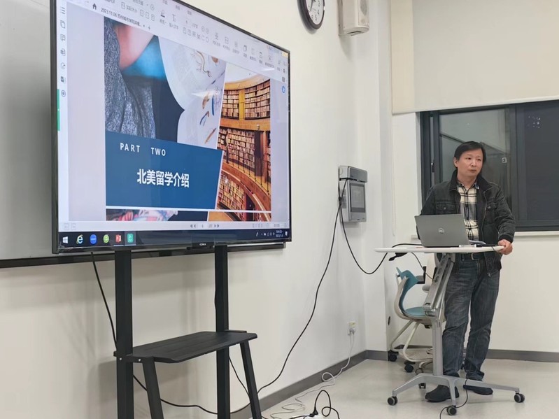何益民老师首先介绍了我校中外合作办学项目班对应美方学校的申请流程,并提醒同学们在本科期间认真学习,提前准备外语考试、标化成绩与申请材料。之后,他对北美方向的研究生申请规划做了全方位指导,详细讲解了美国、加拿大的研究生特点与主要学科申请所需的准备。