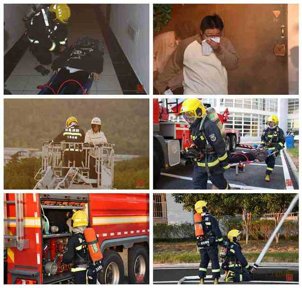 活动开始,5号学生公寓楼冒出阵阵“浓烟”,学生紧急拨打校园报警电话,校微型消防站人员立即赶往现场,疏散引导员组织引导学生从公寓楼里疏散逃生。消防战士冲进“火场”,搜救“受伤被困学生”,担架抬出;用云梯从阳台解救“被困学生”逃生;同时进入火场进行“灭火”。