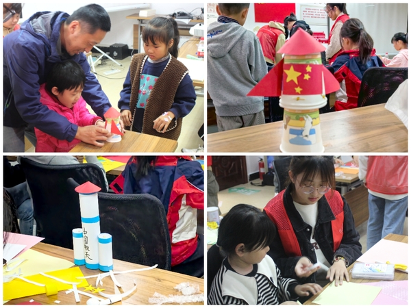 最后,卢业容手把手带着小朋友们一起制作自己的“DIY火箭”。整流罩、发动机、助推器……大家兴致高涨,设计起自己的火箭。不少小朋友“细节满满”,在背景板上绘制出星星,贴上参与互动答题赢来的“人造卫星”等贴纸作为点缀。
