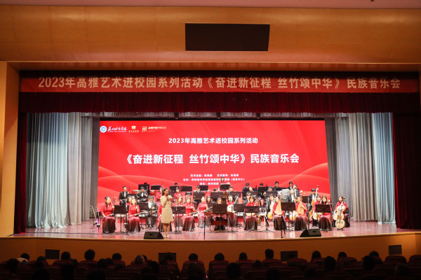 为切实提高学生审美和人文素养,引领广大学生弘扬优秀传统文化,营造校园浓厚的艺术氛围,11月14日下午,我校在多功能厅举办“高雅艺术进校园”《奋进新征程 丝竹颂中华》民族音乐会。本次活动由我校党委宣传部、团委(美育中心)主办,苏州文化投资发展集团有限公司出品,活动邀请到苏州民族管弦乐团演出,我校700余名师生共同参加了活动。