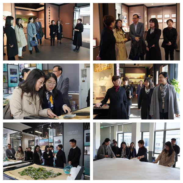 签约仪式前,在胡毓芳的带领下,学校一行参观了太湖雪蚕桑文化园。太湖雪蚕桑文化园荣获全国休闲农业与乡村旅游五星级示范企业,嘉宾们现场参观了蚕桑文化科普展示长廊、蚕的一生动态展示馆、蚕种催青室、科普教育教室-育蚕课堂、茧艺创客工坊、农耕体验区等实践场所。