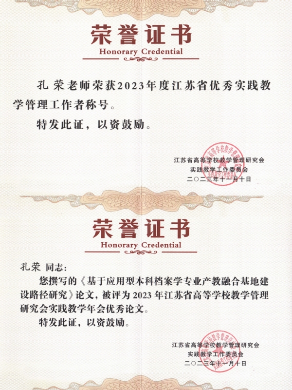年会对全省优秀实践教学管理工作者进行了表彰,我校教务处孔荣同志以近年来推进落实实践教学改革的出色工作表现,荣获“2023年度江苏省优秀实践教学管理工作者”称号。同时,会上还对2023年江苏省实践教学年会优秀论文进行了表彰,我校共投稿五篇,其中孔荣同志撰写的《基于应用型本科档案学专业产教融合基地建设路径研究》荣获年会优秀论文。