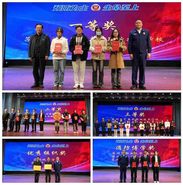 此次知识竞赛分为必答题、抢答题和风险题三个环节,最终得分以“全民消防学习平台”积分情况和现场答题成绩的占比来计算。通过激烈的角逐,最终苏州旅游与财经高等职业技术学校获得一等奖,苏州市职业大学、苏州工业职业技术学院获得二等奖,苏州城市学院、苏州工艺美术职业技术学院、苏州建设交通高等职业技术学校获得三等奖。苏州城市学院、苏州市职业大学获得优秀组织奖。苏州市职业大学的娄翔宇、沈依婷、王箐三人获得“消防博学奖”“积分小达人”称号。