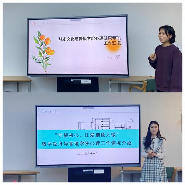 最后,城市文化与传播学院时艳和数字经济与管理学院秦畅分别就学院二级心理工作站建设情况作相关分享。时艳从体制机制、活动开展、学生关心关注计划等对学院“小桔灯”二级心理工作站开展介绍。秦畅从心理个案研讨、学院心理工作格局、心理+校园文化建设、危机事件应对预案等方面进行分享。