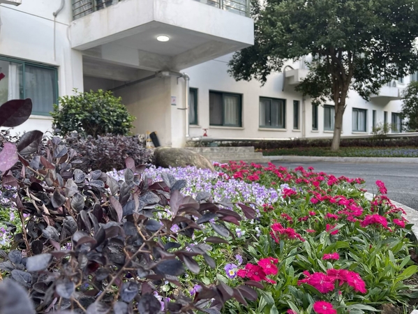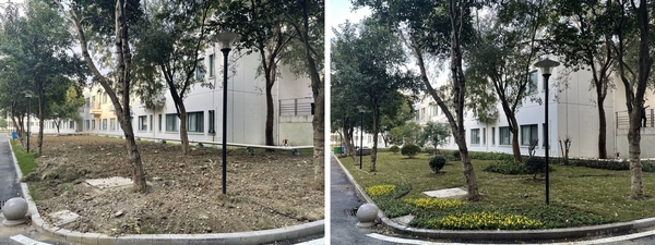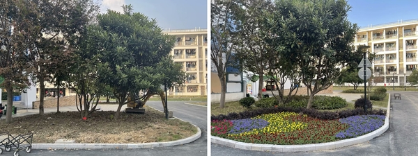 基建与后勤管理处提早筹备,合理制定计划,逐步开展绿植补栽补种工作,有效改善研修楼周边黄土裸露、草坪退化、植物景观不和谐等现象。经过补栽补种,原有区域周边增添了浓浓绿意和点点繁花,展现出生机盎然的面貌。