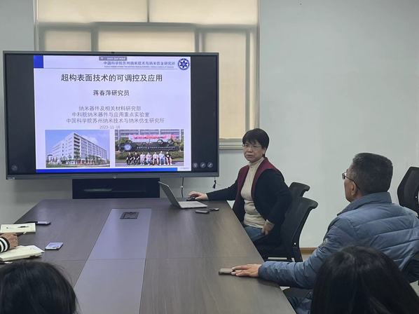随后蒋春萍向学院教师介绍了中国科学院苏州纳米技术与纳米仿生研究所的情况以及其团队的研究方向。中国科学院苏州纳米技术与纳米仿生研究所的重点研究领域是电子信息、生物医学、功能材料,蒋春萍对苏州纳米所的相关配置、未来研究方向以及相关行业的竞争进行了详细讲述,并对此领域的前景进行了深度分析。其团队主要是开展超构表面技术、信息环境健康等方面开展研究,她通过形象的例子对超材料及相关涉及的知识进行了解读。
