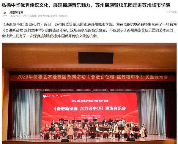 近日,苏州民族管弦乐团走进苏州城市学院,为在场的700余名师生带来了一场名为《奋进新征程丝竹颂中华》的民族音乐会。这场高水准的音乐盛宴,不仅展示了苏州民族管弦乐团的艺术实力,也让师生们有了一次深度接触和欣赏中国优秀传统文化的机会。