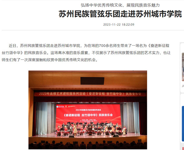 “以美育人、以文化人,苏州城市学院高度重视美育在人才培养过程中的重要作用。”苏州城市学院党委宣传部老师邵杰表示,《奋进新征程丝竹颂中华》民族音乐会作为学校高雅艺术进校园系列活动之一,其目的旨在引领广大学生弘扬优秀传统文化,提升全校师生审美素养,加强学校艺术教育,营造校园浓厚的艺术氛围,丰富校园文化生活,让学生感受到艺术之美、文化之魂。