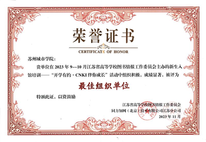 为帮助新生更好地适应学校生活,提高学习能力,提升信息素养,9月至10月开学季期间,我校图书馆(档案馆)组织新生参加了由江苏省高等学校图书情报工作委员会和同方知网(北京)技术有限公司江苏分公司联合举办的“开学有约·CNKI 伴你成长”大学生信息素养提升训练营活动,并荣获“最佳组织单位”称号。