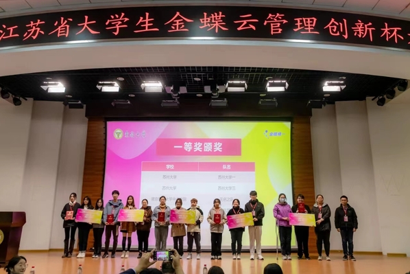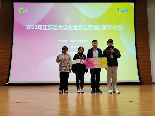 11月26日,江苏省大学生“金蝶云管理创新杯大赛”在东南大学举行。此次大赛由中国商业会计学会、东南大学主办,金蝶精一信息科技服务有限公司承办。金蝶云管理创新杯大赛以培养学生学习能力、实践动手能力、研究创新能力和团队协作为核心价值,推动产教深度整合、实践教学高质量发展的赛事。今年,大赛被列入《2023全国普通高校大学生竞赛分析报告》观察目录,是国内颇具影响力的高校比赛。经过激烈对抗,我院代表队第一次参与该项赛事,荣获江苏省赛区一等奖,全省第四名的优异成绩。
