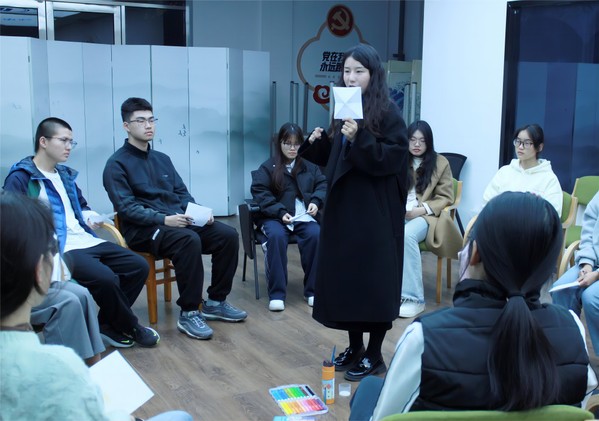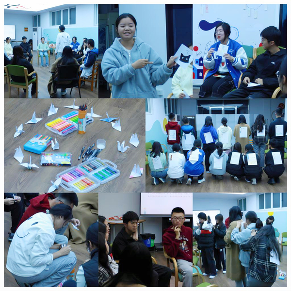 沈怡佳以热身游戏导入,在良好的氛围下引导大家摆脱固有“标签”,以自我联想的方式绘画自我,协助团体成员进行自我探索,发现自己的价值观与特质,增强自我认同。通过“小小千纸鹤”“洞口余生”等活动帮助参与者认识到每个人的独特性,引导其探索未来及自我追求。最后,通过“背上留言”的活动使成员能够更全面地认识自我,培养他们正确对待他人看法和评价的意识和能力。