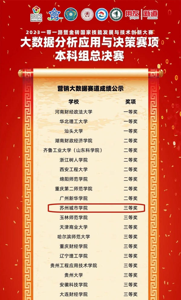 11月25-26日,2023年一带一路暨金砖国家技能发展与技术创新大赛之大数据分析应用与决策赛项全国总决赛于大连财经学院举行。金砖国家技能发展与技术创新大赛(以下简称“大赛”)是2017年金砖国家最高领导人会晤筹备委员会认可、经中华人民共和国外交部备案、金砖国家工商理事会批准的国际大赛。大赛拉开了金砖国家技能竞赛和技术创新合作的序幕,成为推动金砖国家间教育合作、技能开发和人文交流活动的重要平台,得到了金砖五国的高度认可和中华人民共和国外交部、工信部、教育部、人社部、国务院国资委、中国科学技术协会下属相关单位的支持。