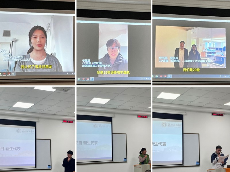 中美121项目的优秀学长学姐代表邵子怡、辛逸航等通过视频向新生发来祝贺与寄语。他们或分析项目所得,或分享在美体验,或用镜头记录校园,鼓励学弟学妹们在大一做好规划、认真学习,以参加中美121项目为契机,取得更大进步。2023级联培班单小川、时斯琦、刘航羽作为新生代表发言,他们讲述了进入城院后的学习经历与生活体验,分享了自己对于未来赴美以及职业生涯的规划,倡议同学们快速适应、积极进取、不负韶华。