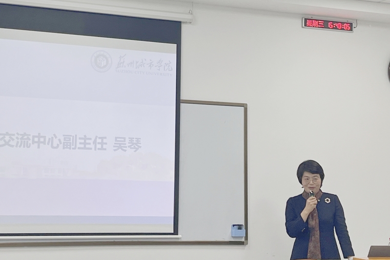 吴琴代表中教国际教育交流中心向苏州城市学院表示感谢,对我校中美121项目新生表示祝贺。随后详细介绍了中教国际教育交流中心的基本情况,以及《中美人才培养计划》121双学位项目近年的发展况,并鼓励同学们学会为人处世、学会开放心态、学会寻求帮助,为明年赴美学习提前打好基础。