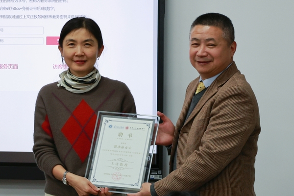 在本期系列讲座尾声,文传院科研与创新工作负责人孙少华老师为郭冰茹教授颁发“名家名课”系列讲座的SCWC001号聘书。孙少华老师对郭冰茹教授的到来表达了由衷的感谢,指出该系列活动是我校的一项创新之举,并对未来“名家名课”系列讲座表达了期望。