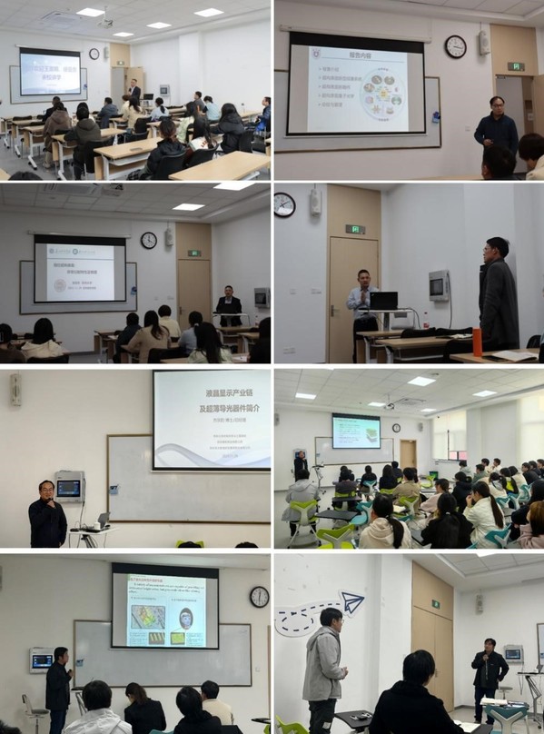 仪式结束后,王漱明、徐亚东、方宗豹、申溯分别以《光学超构表面研究》《超构表面及研究进展》《液晶显示产业链及超薄导光器件简介》《微纳结构在表面装饰中的产业化应用》为题,向光学与电子信息学院在校学生进行专题讲座。