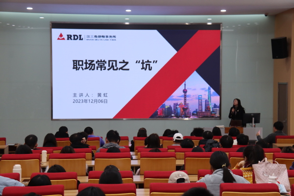为帮助我校准应届毕业生熟悉职场法律、顺利迈好职场第一步,活动的第二部分由黄虹律师从法律从业者的角度,为同学们带来劳动法以及职场相关法律知识分享,引用详实案例和法律条文,深入浅出地讲解大学生初入职场时的“招聘之坑”“加班之坑”“试用期之坑”等劳动过程中容易遇到的问题和解决方法,对即将步入职场的同学们颇有裨益。