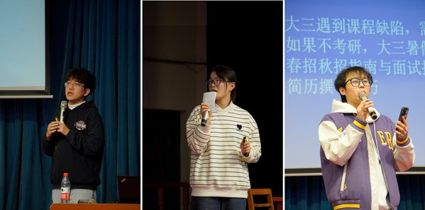 接着,汪朝烨和张奕婷分别从如何择校、考研心路历程以及自己的研究生生活做了详细的分享,他们鼓励学弟学妹们明晰学习目标,根据自身能力、地域选择等方面选择学校,全力以赴备考,掌握科学的学习方法,及时调节备考心态及复习节奏。王澄奕翔着重分享了自己的工作经历以及春招、秋招求职经验。他表示,选择就业,就要通过实习、实训、实践调研,感受职场生活,提高工作能力,为顺利就业打下基础,在职场中不断学习提升。