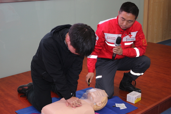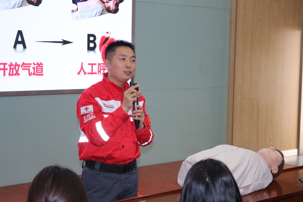 本次培训分为理论和实操两部分。关宏磊老师结合案例,深入浅出地向同学们讲解了心肺复苏术(CPR)和自动体外除颤器(AED)的使用方法。讲解过程中,红十字会老师们用人体模型在现场展示了完整操作流程,并突出强调了CPR的操作要领和使用AED的注意事项,使同学们更加清晰明白。