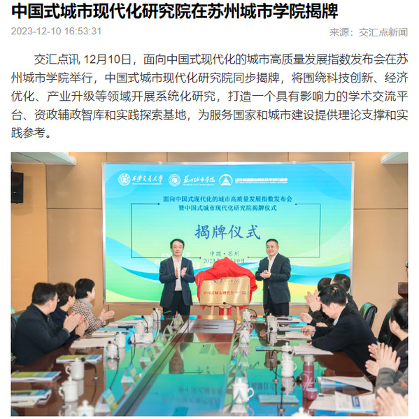 12月10日,面向中国式现代化的城市高质量发展指数发布会在苏州城市学院举行,中国式城市现代化研究院同步揭牌,将围绕科技创新、经济优化、产业升级等领域开展系统化研究,打造一个具有影响力的学术交流平台、资政辅政智库和实践探索基地,为服务国家和城市建设提供理论支撑和实践参考。
