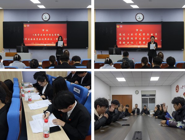 预备会议审议并通过了《光学与电子信息学院第一次学生代表大会秘书长、副秘书长名单(草案)》《光学与电子信息学院第一次学生代表大会代表资格审查报告(草案)》。