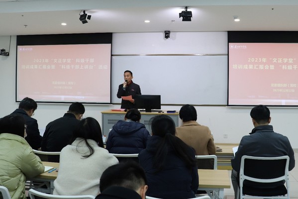 为深入贯彻落实党中央印发的《干部教育培训工作条例》和《全国干部教育培训规划(2023-2027年)》,创新培训形式,提升培训效能。12月12日下午,我校举办“文正学堂”科级干部培训成果汇报会暨“科级干部上讲台”主题活动。校党委常委、党委组织部部长孙德芬,党委组织部副部长邢超,学科建设与科研工作处副处长刘海燕,党委学生工作部副部长卞海勇,计算科学与人工智能学院党委副书记胡荣,全校科级干部参加活动。活动由党校副校长陈波主持。