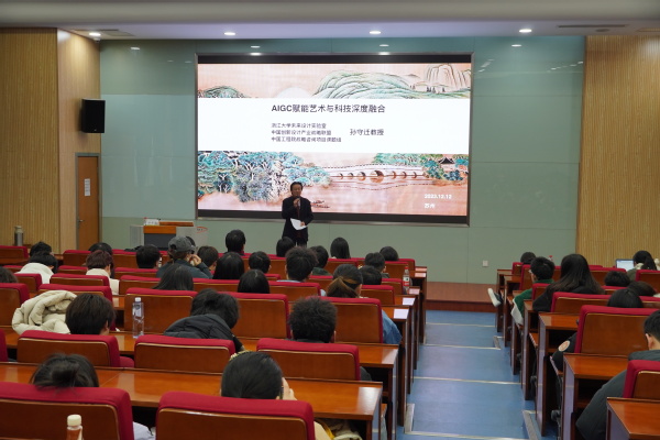 为跟进科技发展前沿、找准学科生长点、把握未来艺术人才特质,进一步提升学院师生专业水平与综合素养,12月12日下午,设计与艺术学院特邀浙江大学计算机科学与技术学院教授、设计学学科学位委员会主任孙守迁作《AIGC赋能艺术与科技深度融合》主题讲座。讲座由设计与艺术学院院长姜竹松教授主持。学院200余名师生现场聆听讲座。