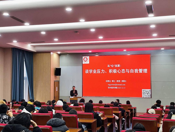 为贯彻落实《苏州城市学院“润心”行动实施方案》工作要求,提升我校心理育人工作实效,12月15日,智能制造与智慧交通学院联合校心理健康教育中心、城市治理与公共事务学院在3-101开展“从‘心’出发:谈学业压力、积极心态与自我管理”心理健康教育主题讲座。本次讲座特别邀请华东师范大学教授、博士生导师段锦云主讲,校心理健康教育中心主任孙伟参加讲座。讲座由智能制造与智慧交通学院团学办公室副主任王帆主持。