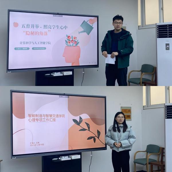 计算科学与人工智能学院毋张明和智能制造与智慧交通学院王帆分别就学院二级心理工作站建设情况作相关分享。毋张明从学生实际情况出发,对学院心理工作的基本情况进行相关说明,提出学院“12345”心理工作法及未来工作方向。王帆结合学院实际情况,从工作概述、工作机制、活动开展和未来计划等方面进行了深入的分享。