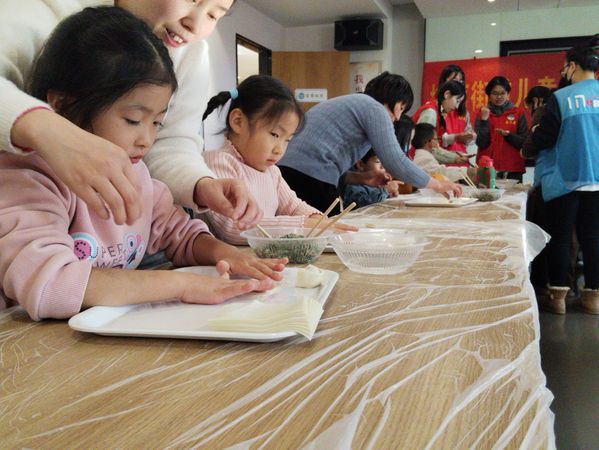 当天上午,志愿者与社区工作人员提前备好包馄饨的肉、菜等各种食材,布置好场地、厨具等,家长们带领小朋友们陆续来到现场。志愿者和社区工作人员向小朋友们讲解包馄饨的方法,带着小朋友们动手包馄饨,“取馄饨皮、放馅、蘸水、压平、捏紧”一气呵成,在志愿者们和小朋友们的努力下,一个个“小白胖子”制作出来,现场气氛温馨欢乐。