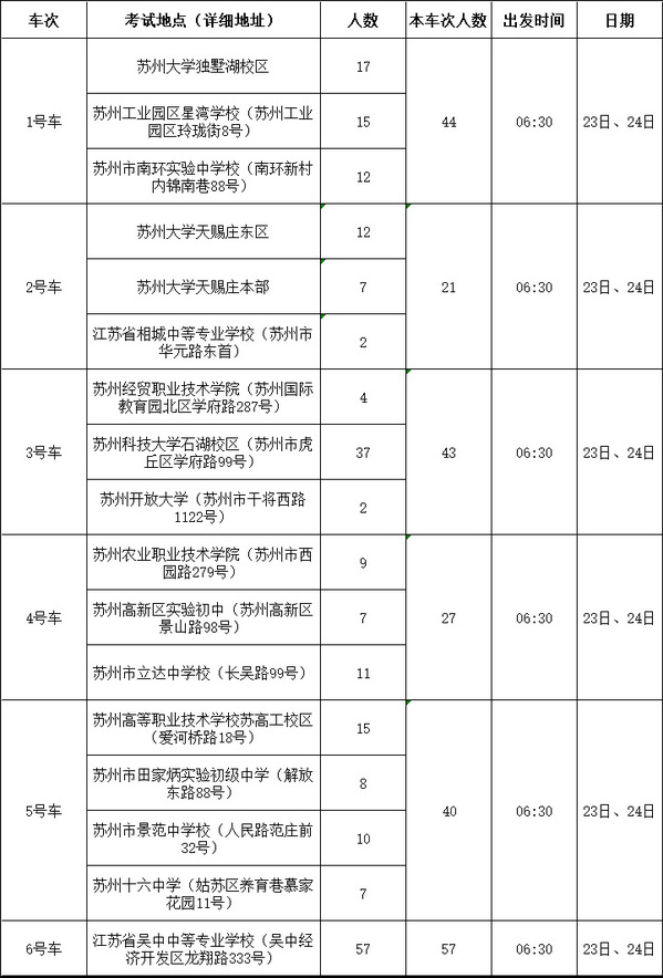 注:苏州工业职业技术学院(吴中大道国际教育园南区瑶泉路6号门)、苏州建设交通高等职业技术学校(吴中大道国际教育园南区)、苏州旅游与财经高等职业技术学校(吴中大道国际教育园南区)因离我校很近,故不安排送考,请在这三个考点参考的学生自行前往。
