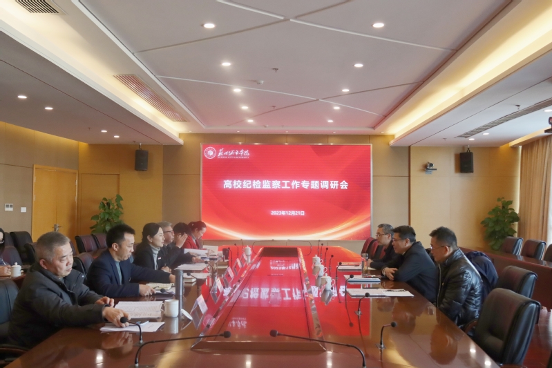 12月21日,苏州市委教育工委、苏州市纪委监委派驻市教育局纪检监察组赴我校开展高校纪检监察工作专题调研。苏州市委教育工委委员、苏州市纪委监委派驻市教育局纪检监察组组长徐海,苏州市纪委监委派驻市教育局纪检监察组四级调研员浦建平,苏州市教育局高等教育处副处长(主持工作)周蔚;我校党委常委、纪委书记、派驻监察专员李萍,党委办公室(校长办公室)主任、发展办主任(兼)张海洋,纪委副书记、纪委办公室主任(兼)袁昌兵,党委组织部副部长、统战部副部长(兼)邢超,机关党委副书记凌亦青,校纪委委员、招生就业处副处长宋丹及纪委办公室相关工作人员出席会议。